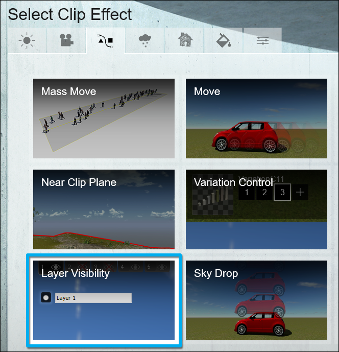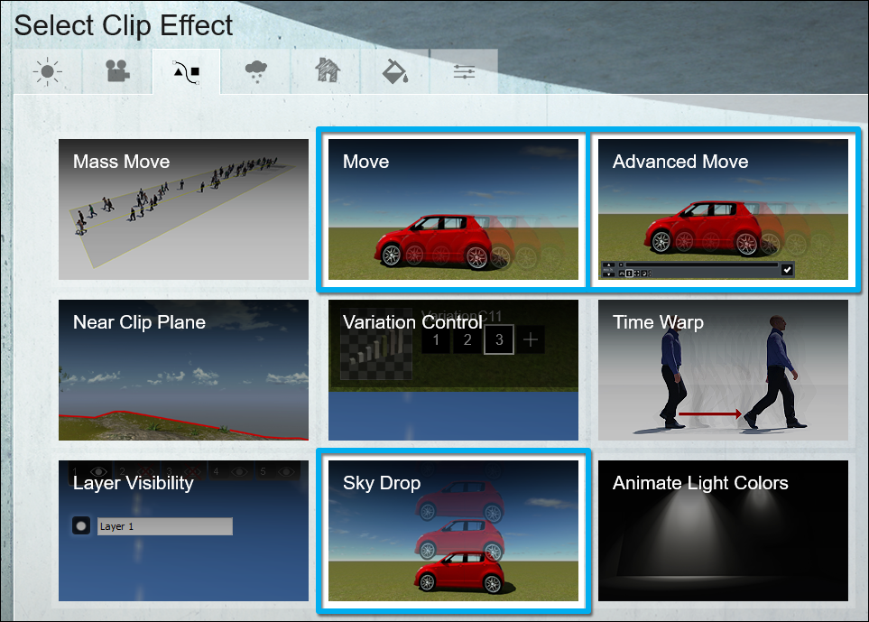 3.3: Then use the Sky Drop, Move and Advanced Move Effects to animate the phases of the construction process, either in individual Clips or with Entire Movie selected.