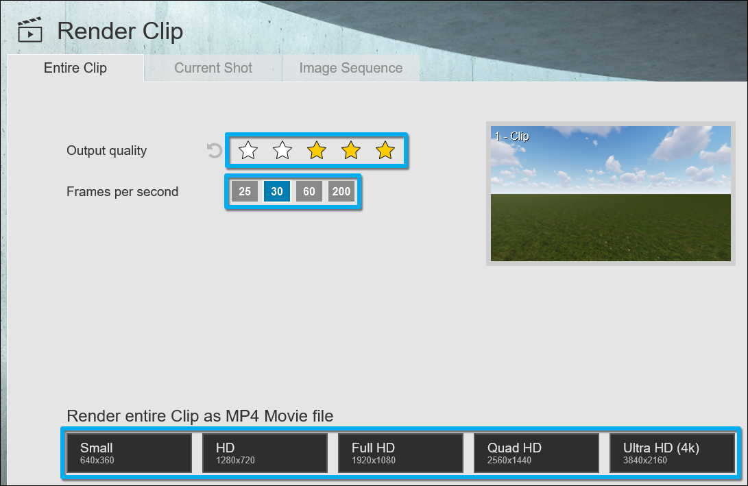 Example: Rendering a Clip at 1280x720 pixels in 3 star quality and 25 frames per second is a lot faster than rendering the Clip at 3840x2160 pixels in 5 star quality and 60 frames per second