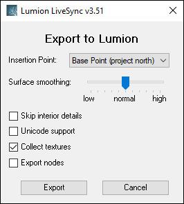 - If ticked, all of the textures that are used by the Revit model will be placed in a folder in the same location as the .DAE file. This tickbox should remain ticked if you need to import the .DAE file on a different computer.