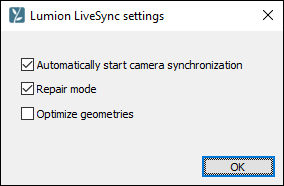 - On: The exporter will attempt to remove unused double-sided surfaces and reconstruct surfaces with incorrect lighting. The exported .DAE/LiveSync file will be smaller and the imported model will be less complex. However, it will take longer to export the .DAE/LiveSync file.