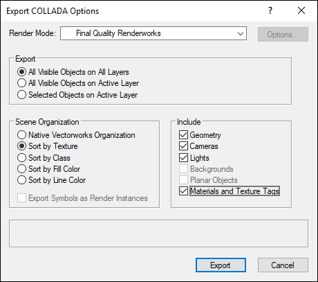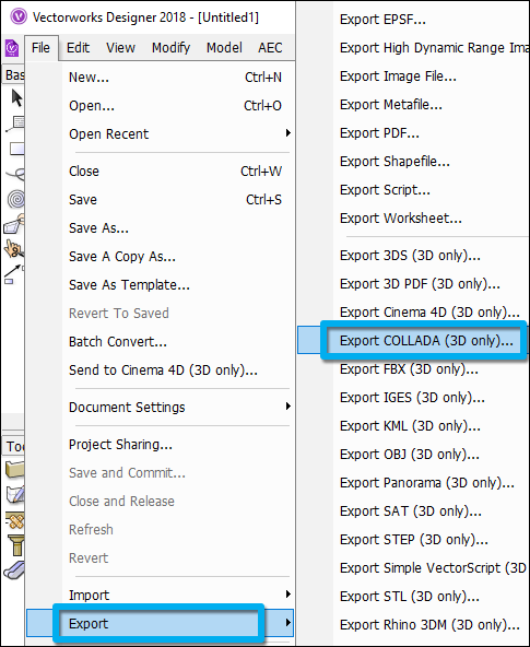 4. Vectorworks 2019 SP2 and older: Export a Collada .DAE file